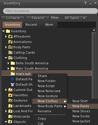 - In the Inventory window, right-click on the Clothing folder, and choose New Folder.