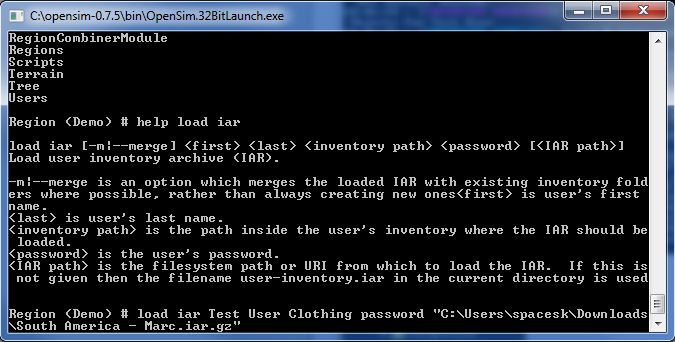 OpenSim includes a facility to load Inventory Archives (or IAR files), and that is what you will have downloaded. We can load these files into a user's inventory through the OpenSim console. The command is: load iar <first> <last> <inventory path> <password> <IAR path>. If you are still using the default Test User account, then the command will be similar to that shown on the bottom line of the image below: