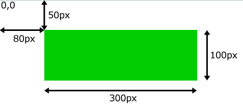 var c = document.getElementById("myCanvas"); var ctx = c.getContext("2d"); ctx.fillStyle="#00CC00"; ctx.fillRect(80, 50, 300, 100);