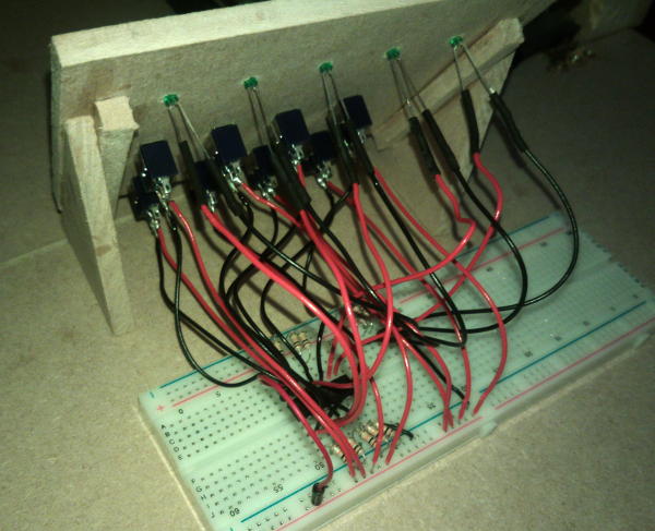 It is quite simple to convert the previous circuit to one that adds two sets of 4-bits. We need eight switches for the inputs, and five LEDs for the outputs. The breadboard would get a little crowded, so I created a wooden stand to hold everything in place.