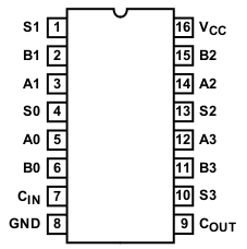 The VCC and GND pins should be familiar from previous articles. These are the pins that you use to supply power to the IC. The CIN and COUT pins are also easy to explain. These are for the carry-in and carry-out bits. A carry-in for the first full-adder in the chain, and a carry-out for the last full-adder in the chain.