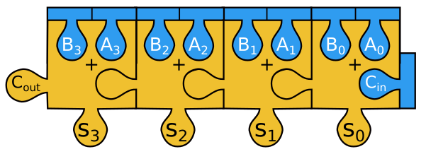 The remaining pins are in four groups, numbered 0, 1, 2, and 3. Each group of pins is for a full-adder in the chain. A and B are the inputs, and S is the sum. The carry bits are handled internally. Going back to the jigsaw metaphor, the inputs and outputs are represented in the following diagram: