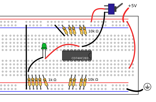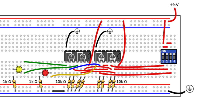 It may look complicated, but the connections are simple. A switch is connected between Vcc and each input. An LED is connected between each output and ground. Just like the previous circuit, a pull down resistor is connected to each input, and there is a resistor in series with each LED to reduce the voltage. The following breadboard diagram shows a single switch connection and a single LED connection as examples: