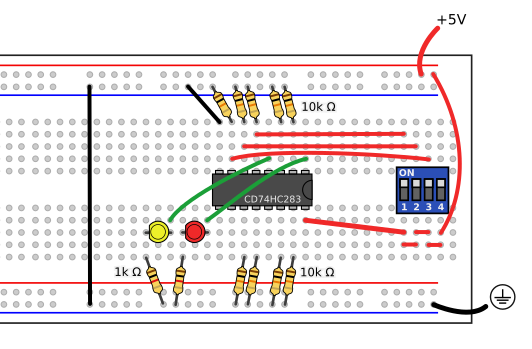 Because the integrated circuits that we used in the previous article each contain four logic gates, we have more than enough to build a full-adder. You might have noticed that there is no OR gate in the circuit below. I simply connected the output from both AND gates to the LED. The consequence is that if there is an output from both AND gates, the LED will receive double the voltage.