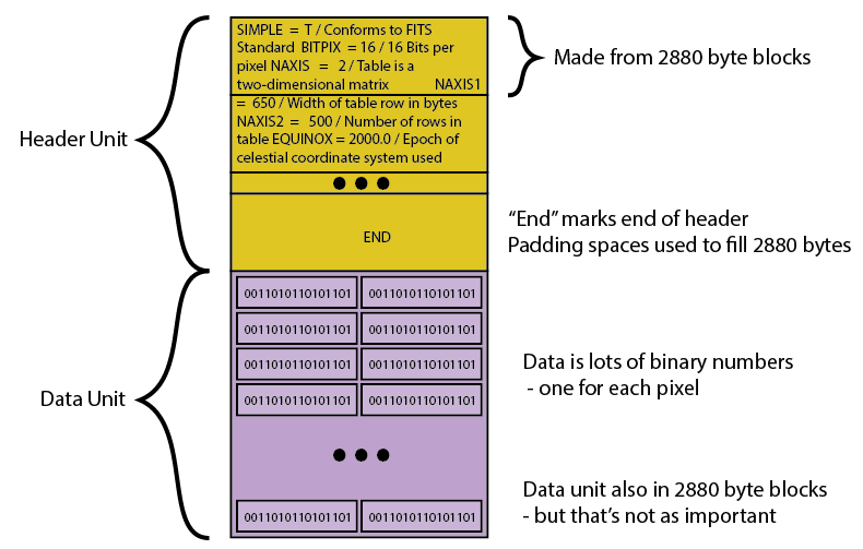 As you scroll through the file you should notice two different types of text. The top part should be readable (even if you’re not sure what it means), and the bottom part that looks like gibberish. The structure of FITS files is essentially like this: