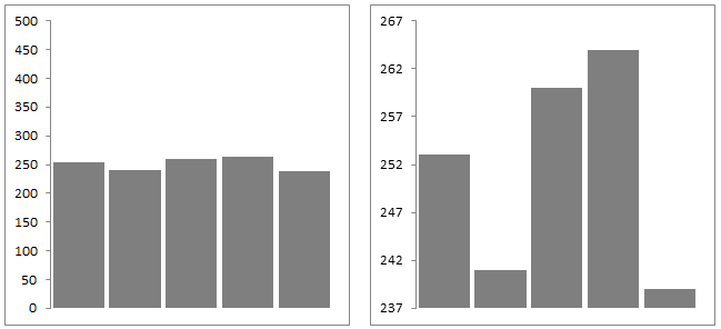 It might be easier to think about the problem if we use some graphs. The two included below actually show the same values, but using different scales. Our image at the moment is a bit like the graph on the left, with most of the pixel values near the middle, but with a broad scale. If we change our scale so that the range is a better fit with our data, then the differences between each value will be easier to see.