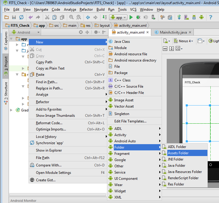 - In the Project area over on the far left, right-click on the app folder and choose New > Folder > Assets Folder.