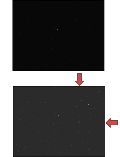 You should get a result similar to that shown below. With logarithmic scaling applied on the right, you can see more stars and the faint ring nebula itself becomes visible (at the intersection of the two arrows).