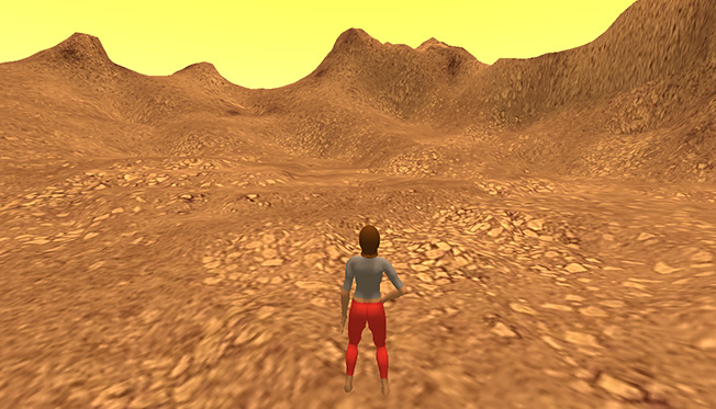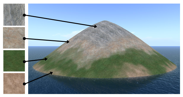 OpenSim uses four image files that repeat across the surface of the terrain. Each image file is assigned a different elevation, so for example the highest elevations have a rock-like image applied to them (for mountains), and in the mid-level elevations a grass image is used. We're going to use some creative licence, and replace all four with red-tinted rock images.
