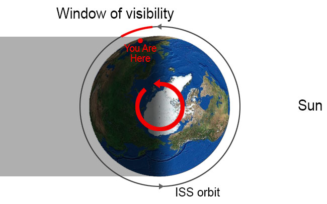 Both the Earth and the ISS are rotating in the same direction (CCW when viewed from the North Pole), although the ISS is rotating much faster. In order to see the ISS there are a number of criteria that need to be met (also shown roughly in the diagram below):